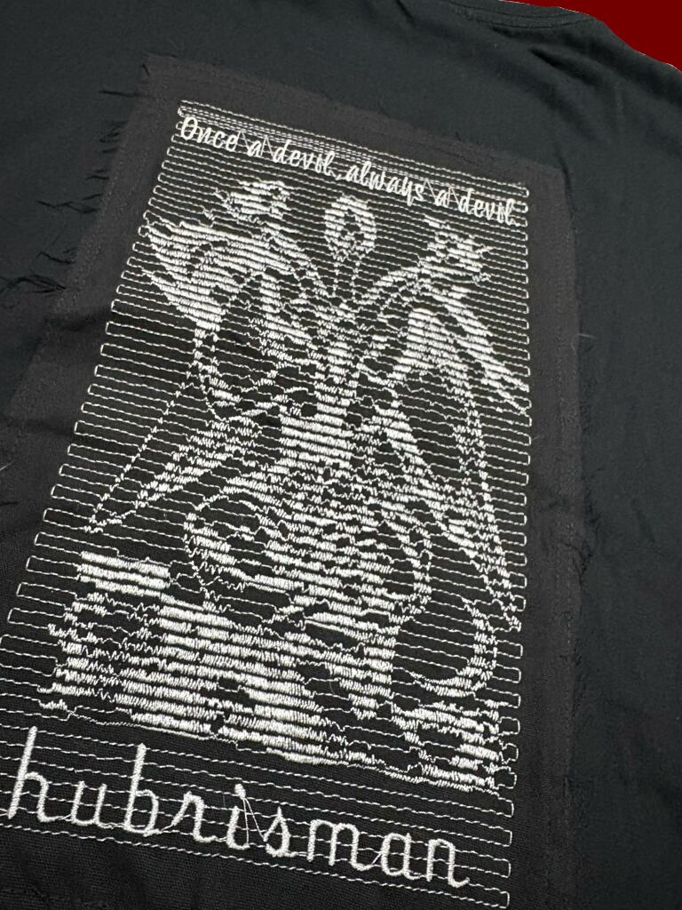 襟元に歪んで走る刺繍はHUBRISMANという名を“呪文”として変換したデザイン