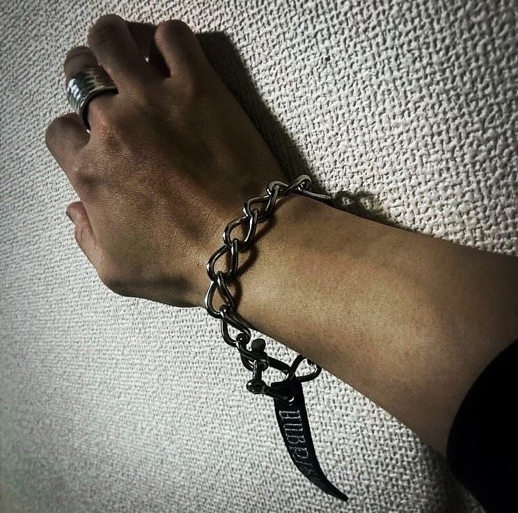 これをシンプルにブランド名のみの刺繍タグに仕上げ、太めのステンレスのブレスレットにあしらったオリジナルアクセサリー。