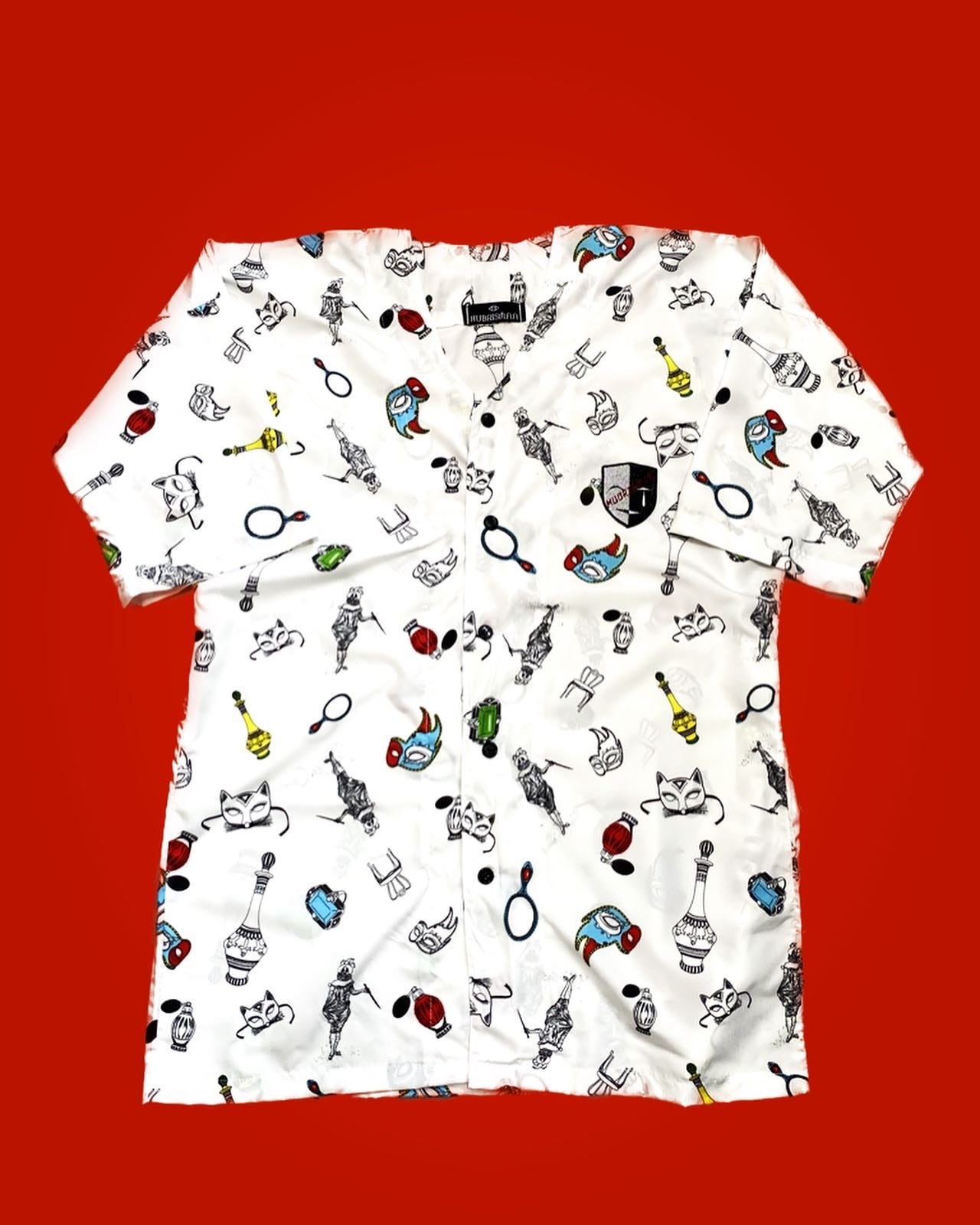 善とされるジキルと悪とされるハイドの表裏一体感を仮面のデザインで表現し、それをワッペンとして少しポップな総柄のルーズシャツに落とし込む事でHUBRISMANの世界観を表現